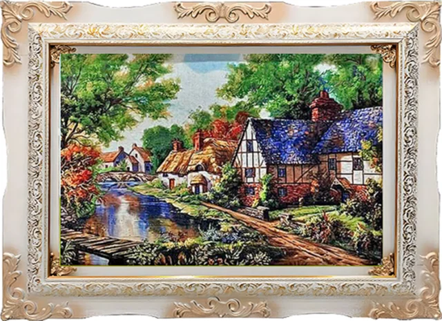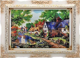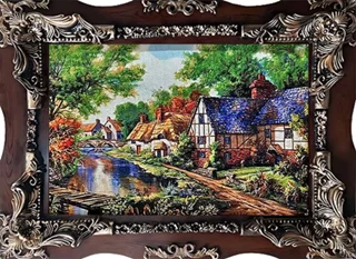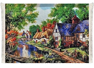 تابلوفرش ماشینی طرح خانه ی روستایی و رودخانه کد 30070 (3 سایز)