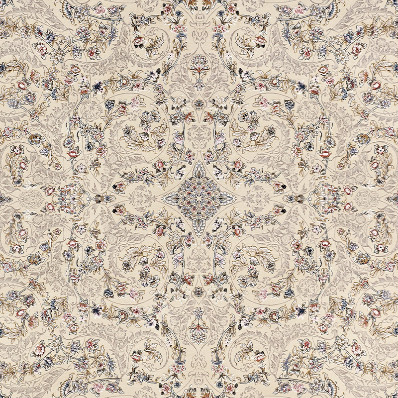 در نگاه نخست، فرش داریوش کاشان گل ابریشم، نمایی چشمنواز از هنر سنتی و طراحی مدرن را در ذهن تداعی میکند. نقوش ظریف گلها، برگها و لچک و ترنج کلاسیک ایرانی با ترکیبی از رنگهای آرامشبخش مانند کرم، نقرهای، فیلی، طوسی روشن، نسکافهای و سرمهای، هارمونی دلنشینی ایجاد میکنند.