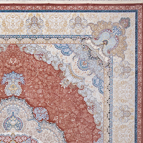 فرش داریوش کاشان یا سعدی کاشان ۱۵۰۰ شانه تراکم ۴۵۰۰ کلکسیون مینیاتور کد ۱۵۲۰ (برجسته - ترنجدار با گل وسط) با ۴ رنگبندی گلبهی، سرمهای، ترمهای و آبی