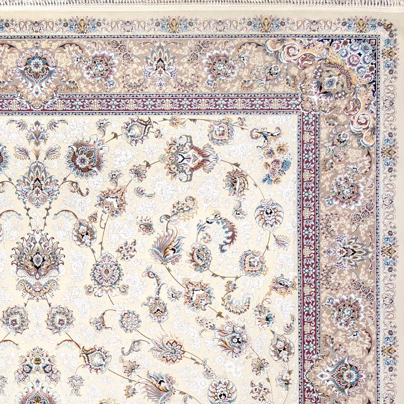 فرش ماشینی ۱۵۰۰ شانه برجسته افشان مینیاتور کاشان کد ۱۵۲۳ – باغ بیمرز نگارگری در ۵ رنگبندی کرم، سرمهای، سفید، ترمهای و آبی با تراکم ۴۵۰۰: افشان مینیاتور با جریان آزاد و بیکران نقشها! طرح کد ۱۵۲۳ افشان برجسته بدون گل وسط از پویاترین و پرطرفدارترین مدلهای کلکسیون مینیاتور برندهای معتبر کاشان (داریوش یا سعدی)، با گلهای شاهعباسی پراکنده، اسلیمیهای جاری و نقشهای ریز مینیاتوری که همچون نقاشیهای آزاد نگارگری ایرانی، سراسر فرش را با جزئیات طبیعی و روان پوشاندهاند. برجستگی سهبعدی گلها و شاخهها، بافتی زنده و دستبافتگونه ایجاد کرده – فرشی که آزادی افشان را با ریزبافتی استثنایی ترکیب کرده و با ۵ رنگبندی پرفروشاش، به راحتی با هر سبک زندگی و دکوراسیونی هماهنگ میشود و فضا را پر از جریان زیبایی، تازگی و حس آرامش میکند.
