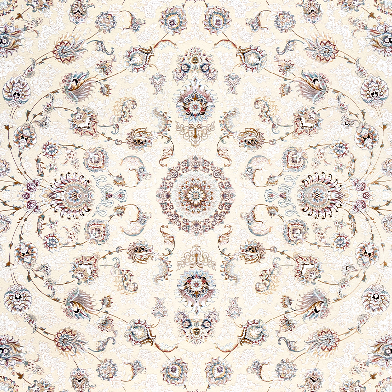 - بافت ریزبافت برجسته دستبافتگونه: شانه ۱۵۰۰ + تراکم ۴۵۰۰ = بیش از ۲.۵ میلیون گره در مترمربع، ارتفاع خاب ۶-۸ میلیمتر برای جلوه سهبعدی روان و مقاومت بالا.