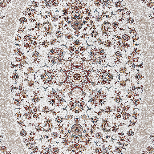 فرش داریوش کاشان یا سعدی کاشان ۱۵۰۰ شانه تراکم ۴۵۰۰ کلکسیون مینیاتور کد ۱۵۲۶ (برجسته - ترنجدار با گل وسط) با ۵ رنگبندی کرم، سفید، سرمهای، ترمهای و آبی