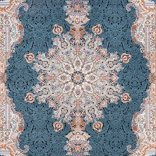 فرش داریوش کاشان یا سعدی کاشان ۱۵۰۰ شانه تراکم ۴۵۰۰ کلکسیون مینیاتور کد ۱۵۲۸ (برجسته - ترنجدار با گل وسط) با ۷ رنگبندی سرمهای، سفید، ترمهای، آبی، گلبهی، فیلی و طلایی