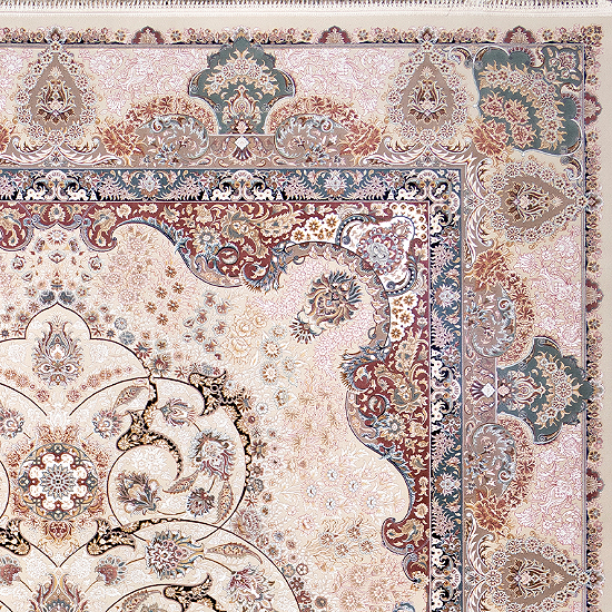 - بافت ریزبافت برجسته دستبافتگونه: شانه ۱۵۰۰ + تراکم ۴۵۰۰ = بیش از ۲.۵ میلیون گره در مترمربع، ارتفاع خاب ۶-۸ میلیمتر برای جلوه سهبعدی روان و مقاومت بالا.