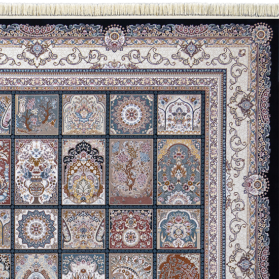 - بافت ریزبافت برجسته دستبافتگونه: شانه ۱۵۰۰ + تراکم ۴۵۰۰ = بیش از ۲.۵ میلیون گره در مترمربع، ارتفاع خاب ۶-۸ میلیمتر برای جلوه سهبعدی قابها و مقاومت بالا.