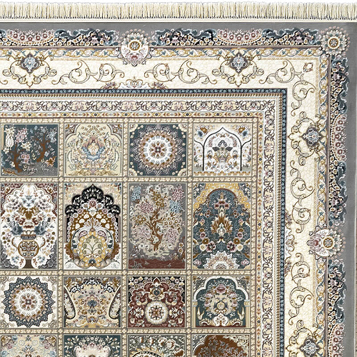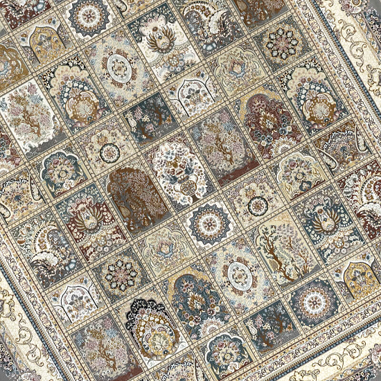 - بافت ریزبافت برجسته دستبافتگونه: شانه ۱۵۰۰ + تراکم ۴۵۰۰ = بیش از ۲.۵ میلیون گره در مترمربع، ارتفاع خاب ۶-۸ میلیمتر برای جلوه سهبعدی قابها و مقاومت بالا.