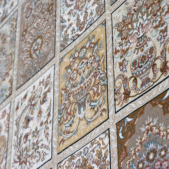 - بافت ریزبافت برجسته دستبافتگونه: شانه ۱۵۰۰ + تراکم ۴۵۰۰ = بیش از ۲.۵ میلیون گره در مترمربع، ارتفاع خاب ۶-۸ میلیمتر برای جلوه سهبعدی قابها و مقاومت بالا.
