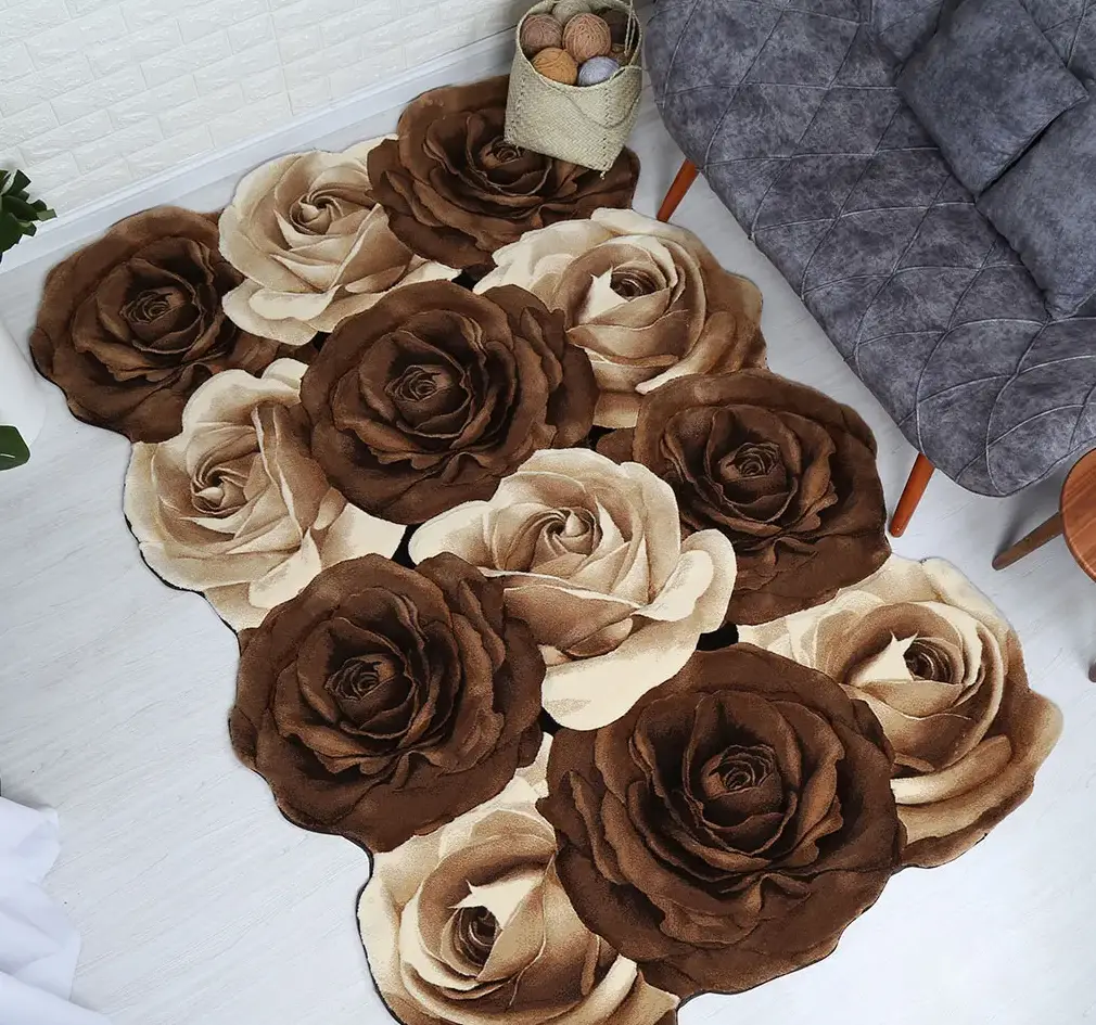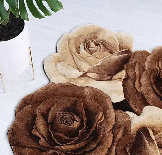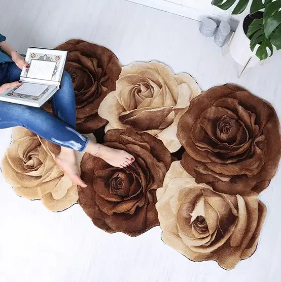 فرش زرباف سه بعدی پرزبلند طرح رز مینیاتوری زمینه شکلاتی (شگی)