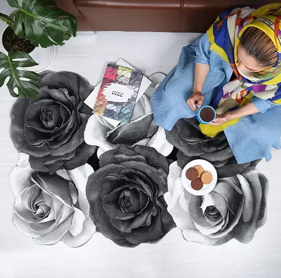 فرش زرباف سه بعدی پرزبلند طرح رز مینیاتوری زمینه طوسی (شگی)