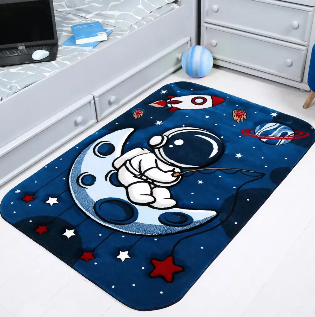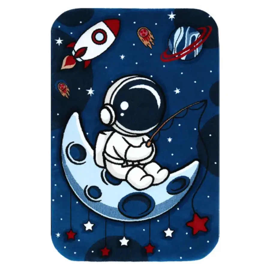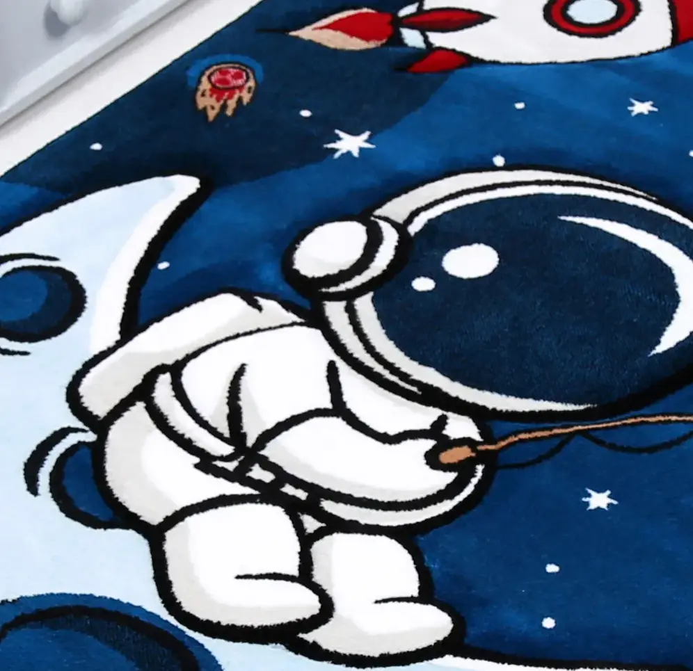 فرش زرباف سه بعدی پرزبلند طرح فضانورد زمینه سورمه ای (شگی)