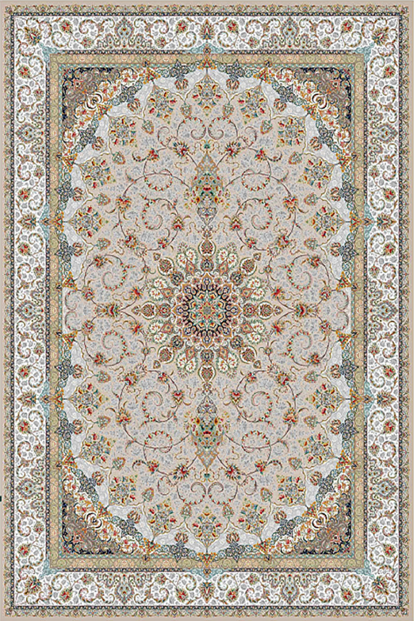 - طرح و رنگبندی: طرح **ترنجدار با گل برجسته**، همراه با المانهای افشان، خشتی، هندسی، ماهی و ریزماهی، تلفیقی از نقوش اصیل ایرانی و سبکهای مدرن است. **رنگ زمینه 1010 روشن** با طیفهای کرم، نقرهای، فیلی، سورمهای و طوسی تیره، فضا را بزرگتر و روشنتر نشان میدهد. **9 رنگ واقعی** در بافت، جلوهای زنده و سهبعدی ایجاد میکند – ایدهآل برای **فرش کلاسیک** یا **فرش مدرن**.