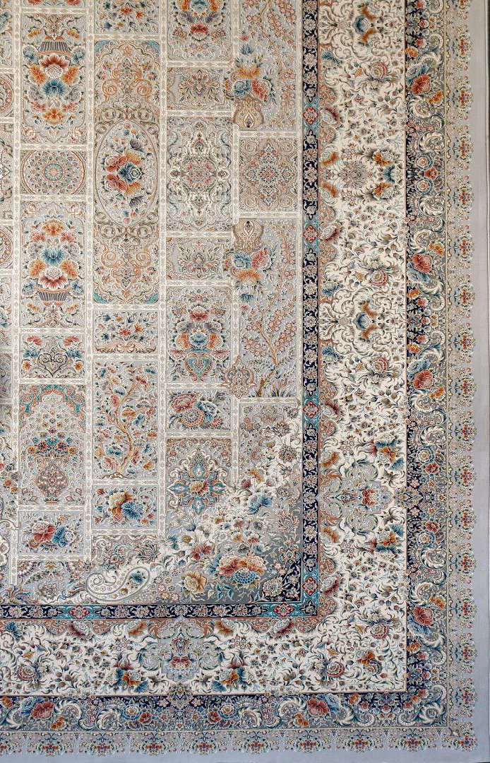 فرش ماشینی ۱۵۰۰ شانه برجسته خشتی هندسی ستاره کویر یزد کد TX503 زمینه نقرهای (۱۰۳۰) – کلکسیون ستارگان کویر – درخشش هندسه مدرن با تراکم ۴۵۰۰: هندسه درخشان در آسمان نقرهای! طرح TX503 خشتی هندسی برجسته از جسورانهترین و لوکسترین آثار کلکسیون ستارگان کویر، با قابهای خشتی منظم، خطوط شکسته دقیق و نقشهای هندسی که مانند یک اثر هنری معاصر میدرخشند. برجستگی سهبعدی قابها و خطوط، فرشی پر از نور، ساختار و انرژی مثبت میسازد – انگار یک شبکه هندسی نقرهکوب شده زیر پای شما پهن شده که نظم، قدرت و زیبایی مدرن را همزمان به فضا تزریق میکند.