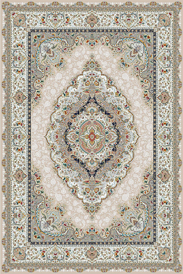 یکی از مهمترین دلایل محبوبیت این فرش، طراحی چشمنواز و هماهنگی رنگهاست. در این مدل، زمینه 1077 که ترکیبی از رنگهای ملایم و روشن است، جلوهای دلنشین و آرامبخش دارد. این رنگ باعث میشود فضا بزرگتر، دلبازتر و روشنتر به نظر برسد. طرح ترنجدار (گل وسط) از دیرباز یکی از نمادهای اصلی فرش ایرانی بوده است. در این طرح، گل مرکزی یا همان ترنج، در مرکز فرش جای گرفته و اطراف آن را لچکها و نقشمایههای اصیل ایرانی فرا گرفتهاند. در این مدل، ترنج بهصورت برجسته بافته شده تا جلوهای سهبعدی و فاخر به مرکز فرش ببخشد و توجه را به مرکز اتاق جلب کند. رنگهای استفادهشده در این طرح شامل طیفی از طلایی ملایم، بژ، نقرهای روشن، کرم و فیلی است که با هم هماهنگی چشمگیری دارند و با انواع دکوراسیونهای کلاسیک و مدرن سازگارند.