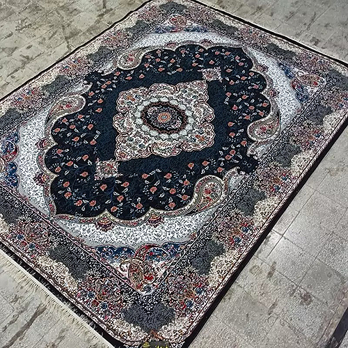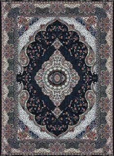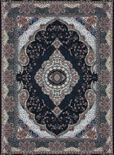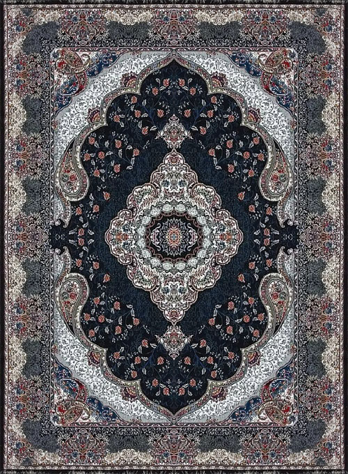 فرش ماشینی بافت رخ 440 شانه طرح ترمه زمینه سورمه ای (غیربرجسته)