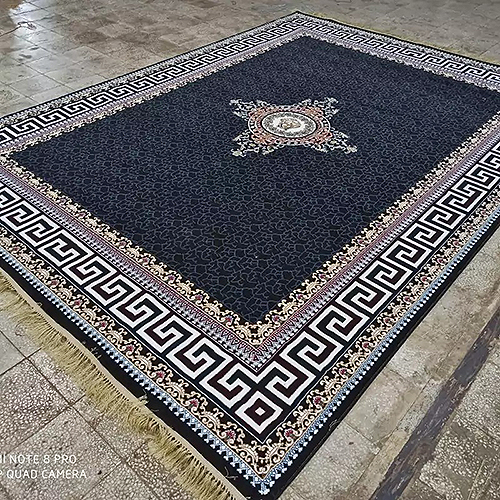فرش ماشینی بافت رخ 440 شانه طرح ورساچه زمینه مشکی (غیربرجسته)