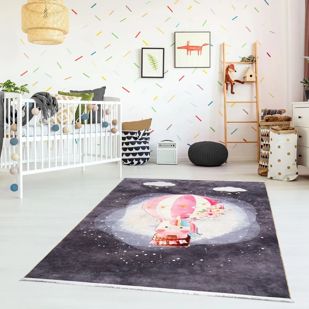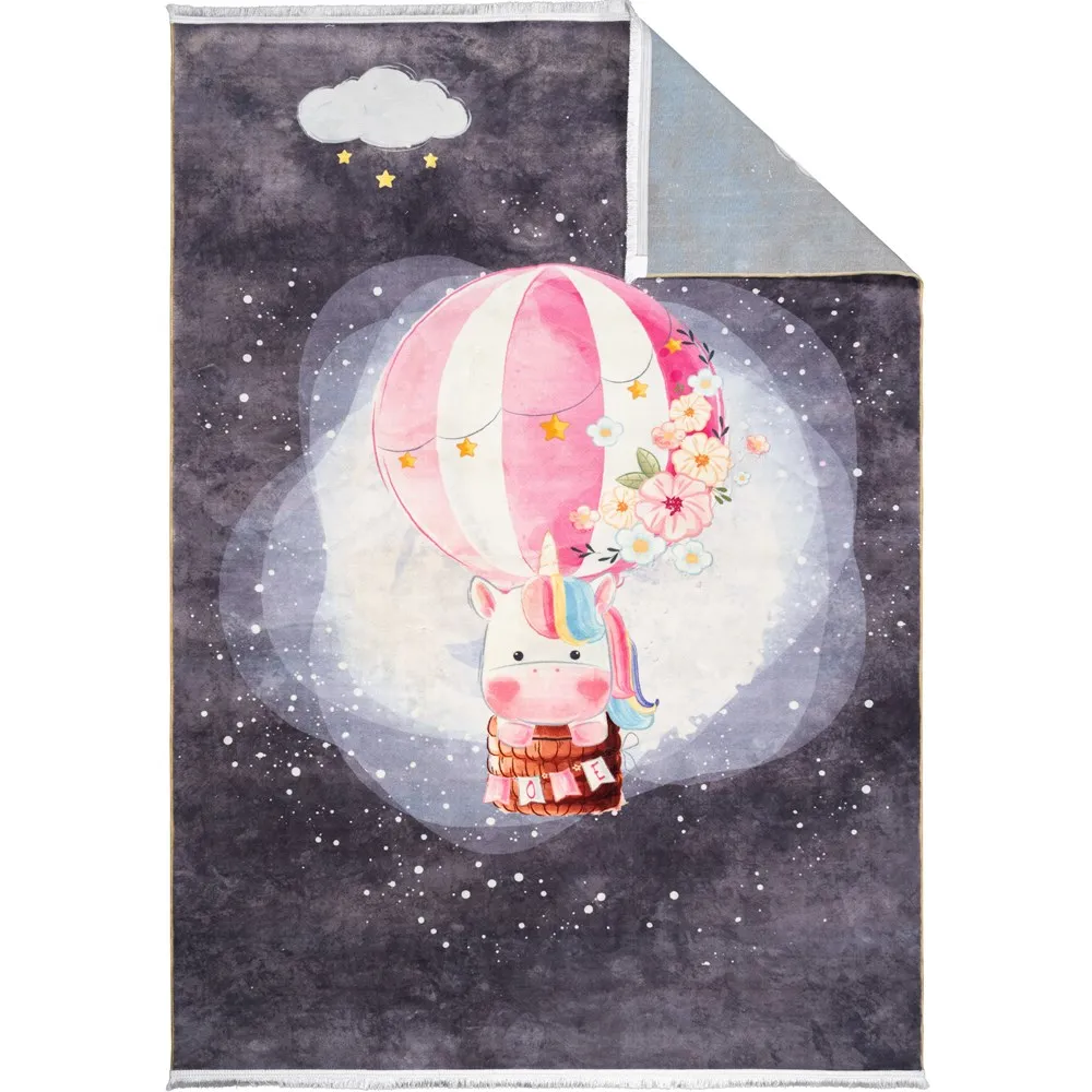 فرش محتشم اتاق کودک طرح اسب تک شاخ بالن سوار کد 2599009090 زمینه تمام رنگ (غیربرجسته)