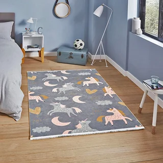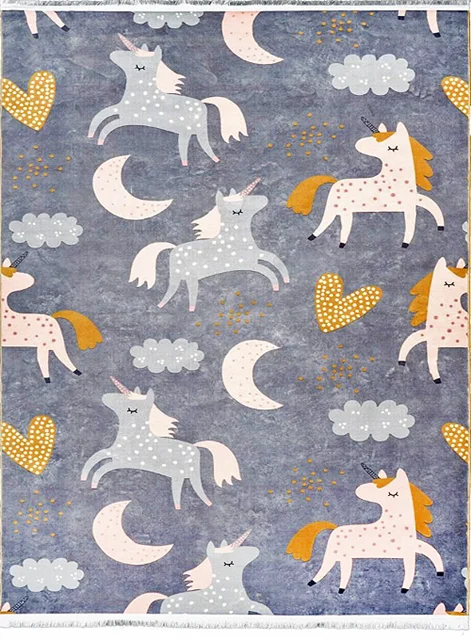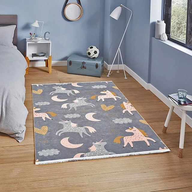 فرش محتشم اتاق کودک طرح اسب تک شاخ کد 101279 زمینه طوسی (غیربرجسته)