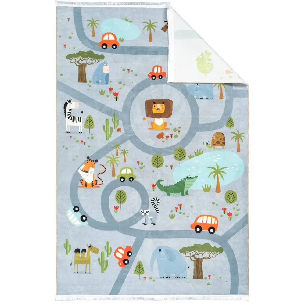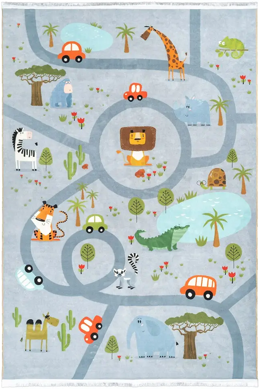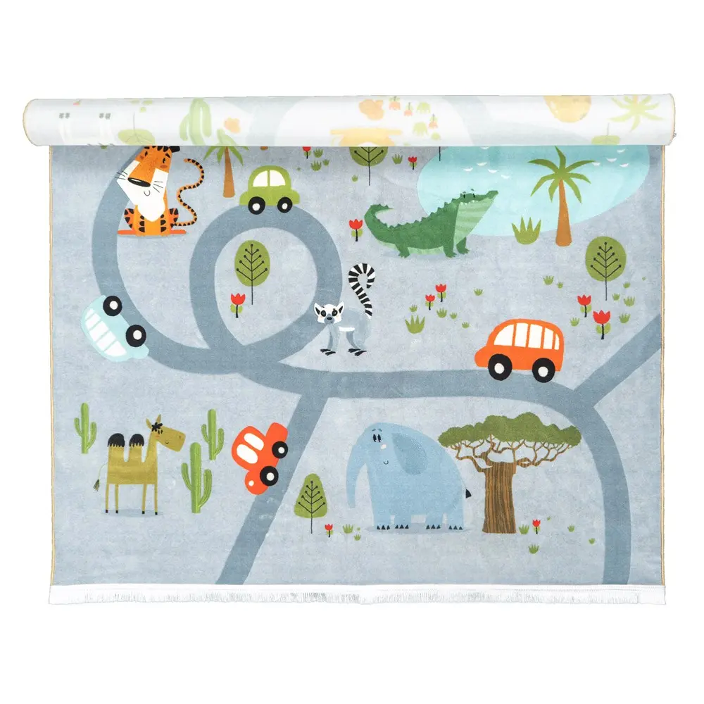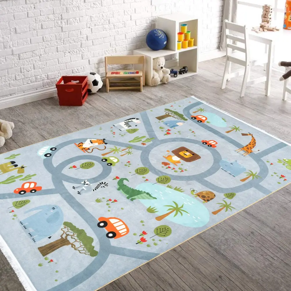 فرش محتشم اتاق کودک طرح جاده حیوانات کد 101291 زمینه تمام رنگ (غیربرجسته)
