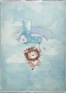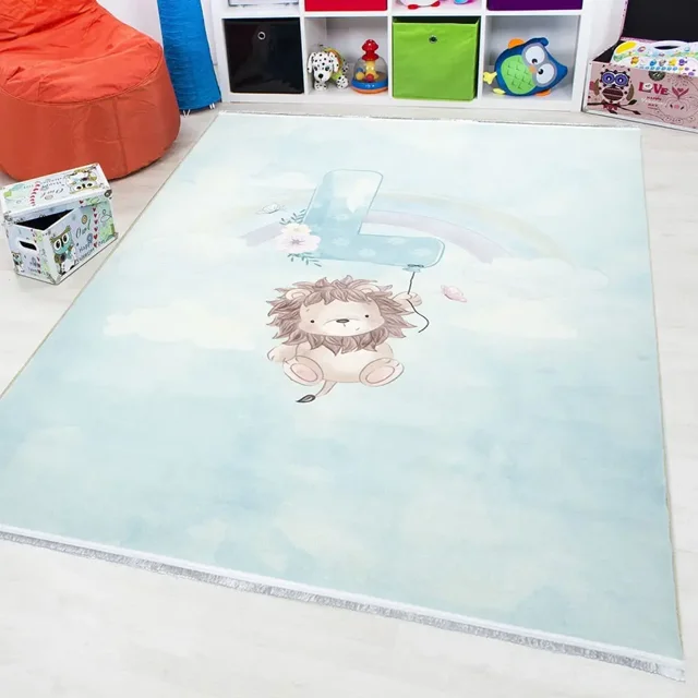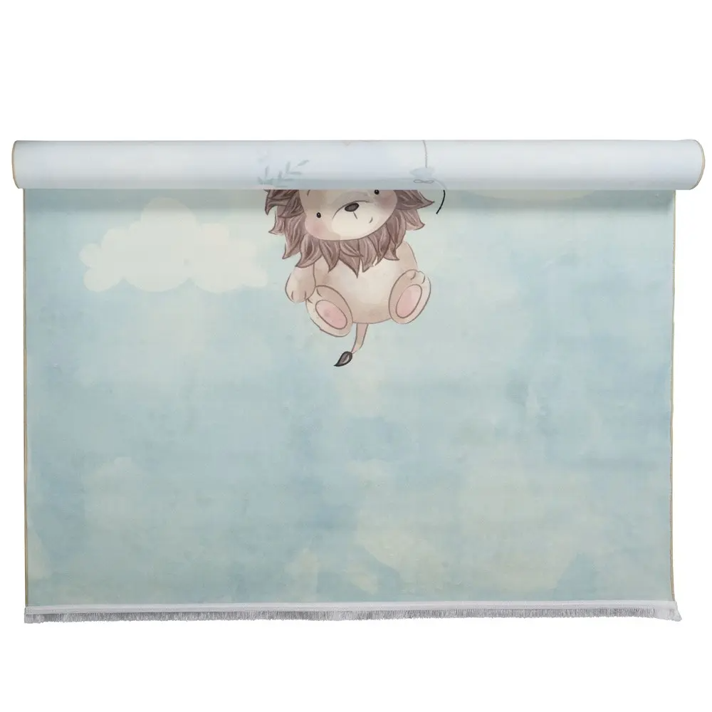 فرش محتشم اتاق کودک طرح شیر بازیگوش کد 101275 زمینه سبزآبی (غیربرجسته)