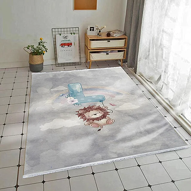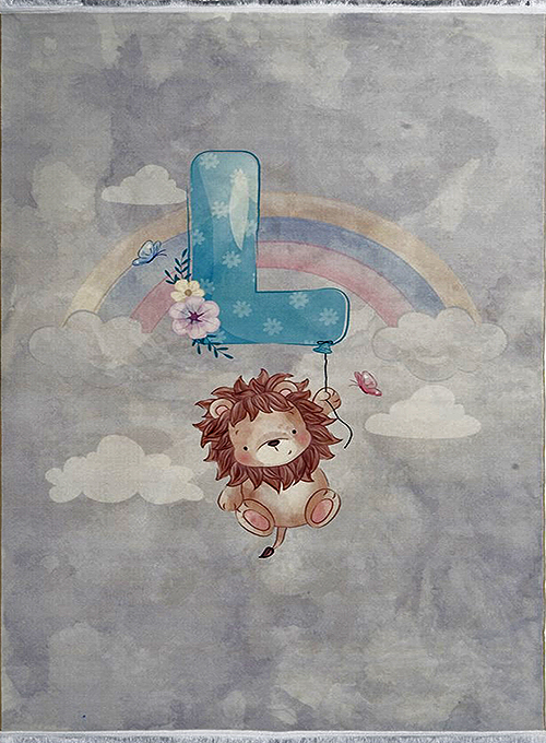 فرش محتشم اتاق کودک طرح شیر بازیگوش کد 101275 زمینه طوسی (غیربرجسته)