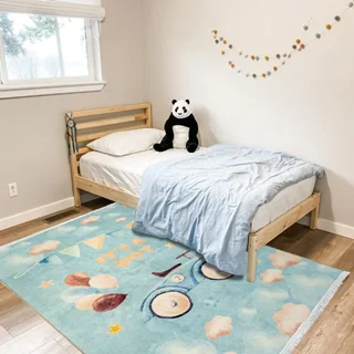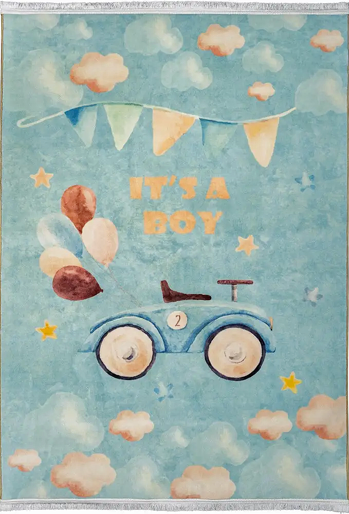 فرش محتشم اتاق کودک طرح ماشین و بادکنک کد 101258 زمینه آبی (غیربرجسته)