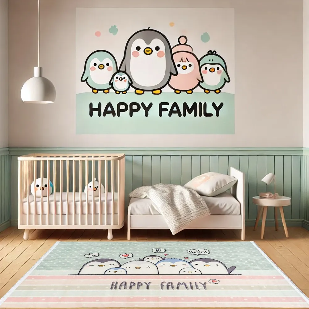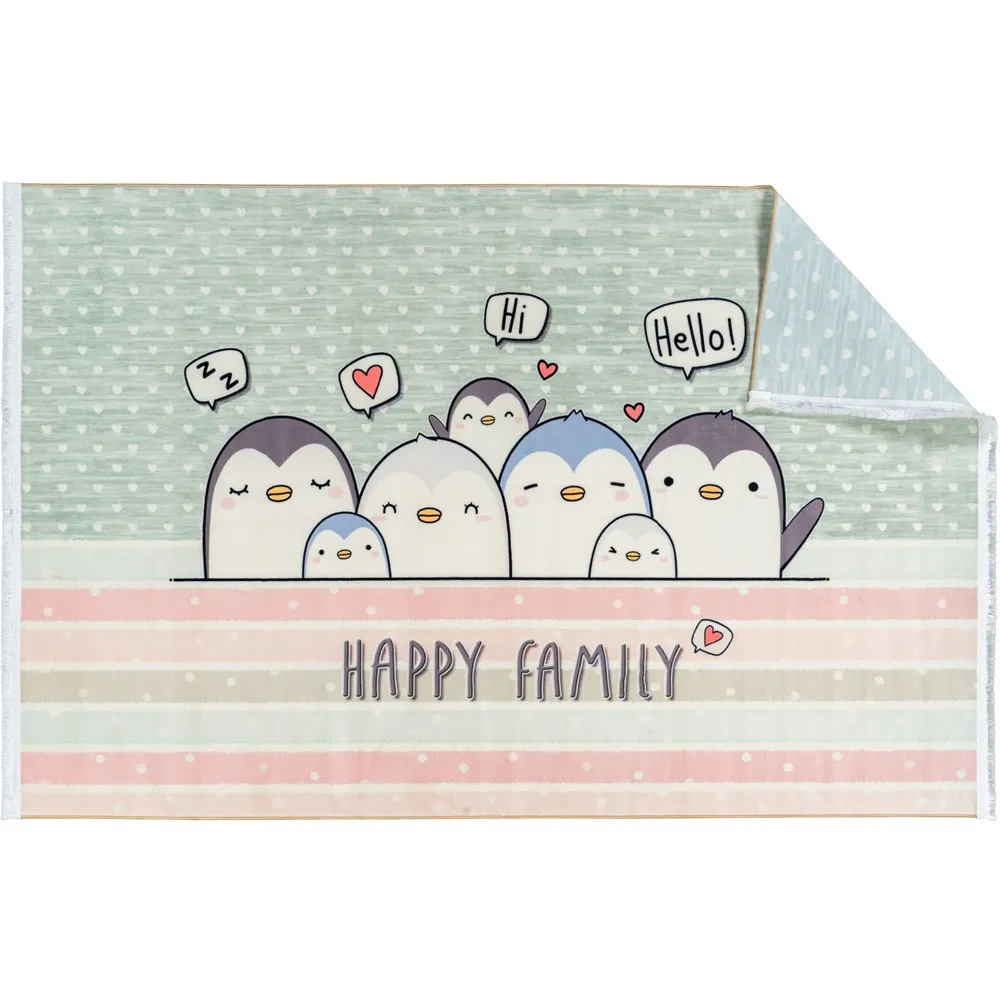 فرش محتشم اتاق کودک طرح پنگوئن ها کد 25km0170 زمینه سبز (غیربرجسته)