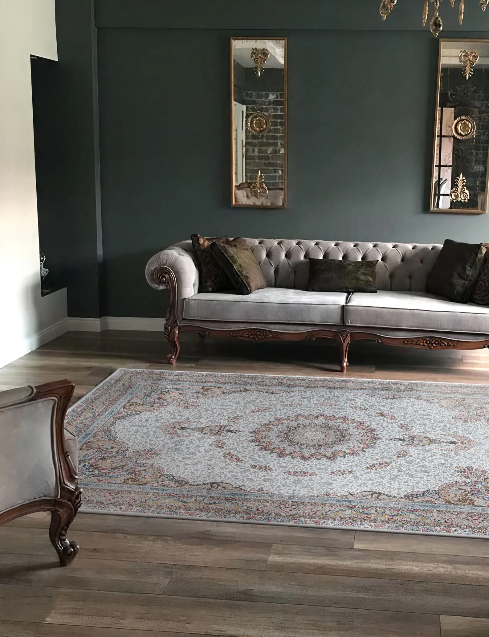 فرش ماشینی ۱۵۰۰ شانه برجسته ترنجدار مهدیان کاشان کلکسیون والری ابریشمی – ابریشمگونه لوکس با ترنج سلطنتی و ۶ رنگبندی الماسی تا بژ با تراکم ۴۵۰۰: ترنج ابریشمی والری با درخشش الماسی و رنگهای رویایی! طرح ترنجدار برجسته کلکسیون والری ابریشمی از لوکسترین و پرفروشترین سریهای برند معتبر مهدیان کاشان، با ترنج مرکزی بزرگ و پرجزئیات، گل شاهعباسی برجسته در قلب فرش و حاشیههای اسلیمی ظریف که حس ابریشم واقعی دستبافت را با بافت ماشینی فوقالعاده ریز منتقل میکند. برجستگی سهبعدی ترنج، گل مرکزی و نقشها، همراه با نخ اکریلیک هیتست ابریشمی، بافتی مخملی و درخشان ایجاد کرده – فرشی که والری ابریشمی را به سطح جدیدی از لوکس بودن رسانده و با ۶ رنگبندی خیرهکنندهاش، خانه را به یک کاخ مدرن-کلاسیک تبدیل میکند.