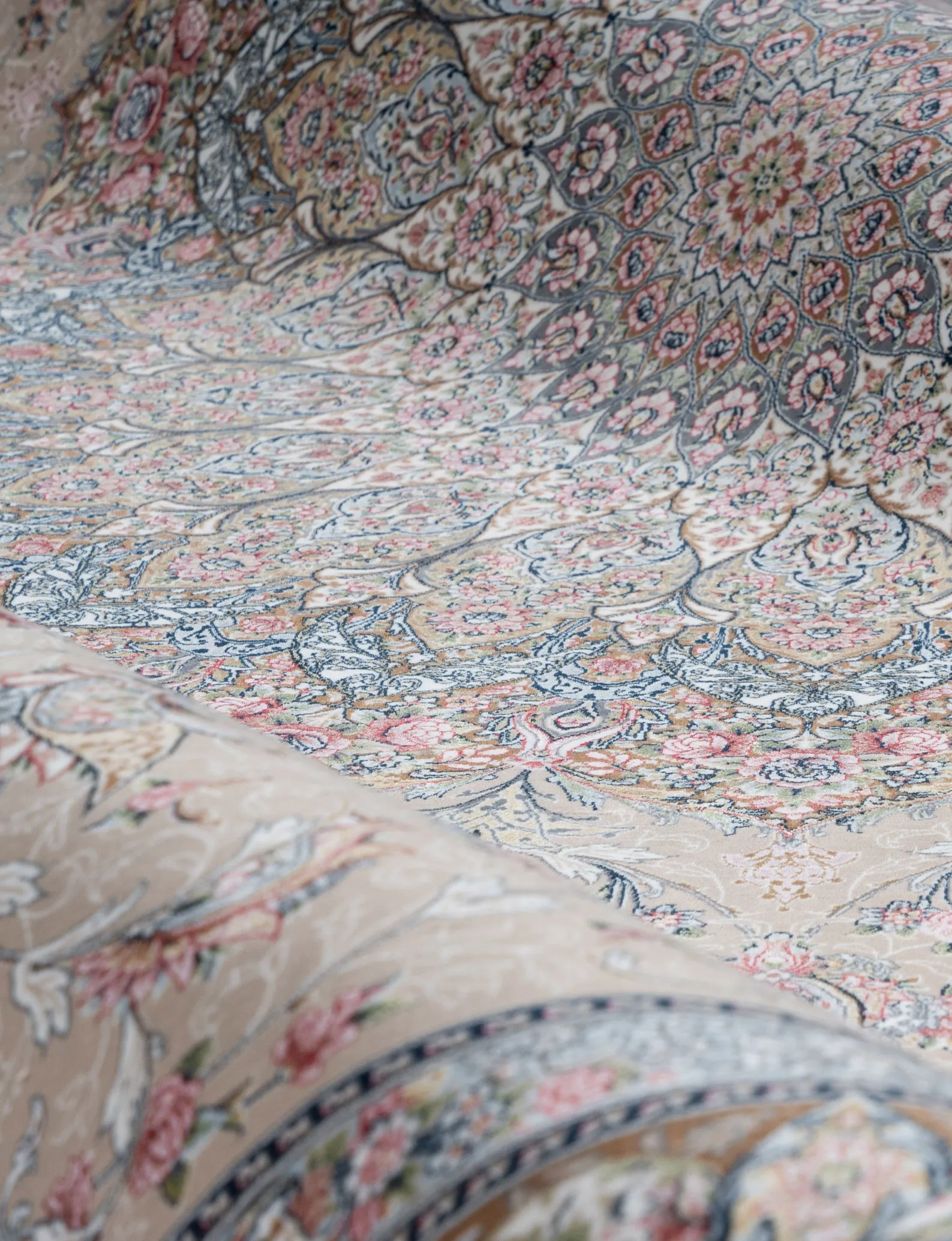 فرش ماشینی ۱۵۰۰ شانه برجسته ترنجدار مهدیان کاشان کلکسیون والری ابریشمی – ابریشمگونه لوکس با ترنج سلطنتی و ۶ رنگبندی الماسی تا بژ با تراکم ۴۵۰۰: ترنج ابریشمی والری با درخشش الماسی و رنگهای رویایی! طرح ترنجدار برجسته کلکسیون والری ابریشمی از لوکسترین و پرفروشترین سریهای برند معتبر مهدیان کاشان، با ترنج مرکزی بزرگ و پرجزئیات، گل شاهعباسی برجسته در قلب فرش و حاشیههای اسلیمی ظریف که حس ابریشم واقعی دستبافت را با بافت ماشینی فوقالعاده ریز منتقل میکند. برجستگی سهبعدی ترنج، گل مرکزی و نقشها، همراه با نخ اکریلیک هیتست ابریشمی، بافتی مخملی و درخشان ایجاد کرده – فرشی که والری ابریشمی را به سطح جدیدی از لوکس بودن رسانده و با ۶ رنگبندی خیرهکنندهاش، خانه را به یک کاخ مدرن-کلاسیک تبدیل میکند.