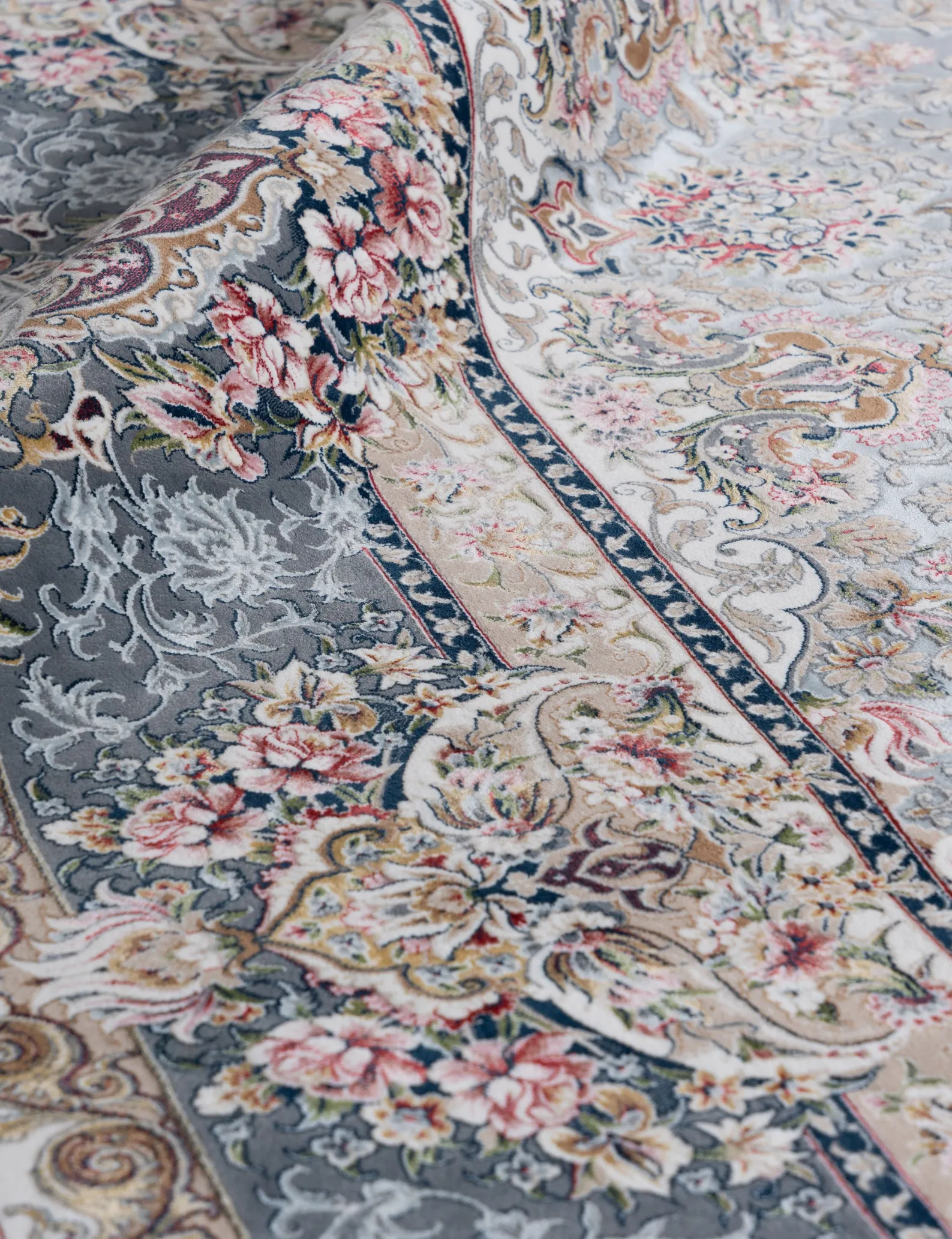 فرش ماشینی ۱۵۰۰ شانه برجسته ترنجدار مهدیان کاشان کلکسیون والری ابریشمی – ابریشمگونه لوکس با ترنج سلطنتی و ۶ رنگبندی الماسی تا بژ با تراکم ۴۵۰۰: ترنج ابریشمی والری با درخشش الماسی و رنگهای رویایی! طرح ترنجدار برجسته کلکسیون والری ابریشمی از لوکسترین و پرفروشترین سریهای برند معتبر مهدیان کاشان، با ترنج مرکزی بزرگ و پرجزئیات، گل شاهعباسی برجسته در قلب فرش و حاشیههای اسلیمی ظریف که حس ابریشم واقعی دستبافت را با بافت ماشینی فوقالعاده ریز منتقل میکند. برجستگی سهبعدی ترنج، گل مرکزی و نقشها، همراه با نخ اکریلیک هیتست ابریشمی، بافتی مخملی و درخشان ایجاد کرده – فرشی که والری ابریشمی را به سطح جدیدی از لوکس بودن رسانده و با ۶ رنگبندی خیرهکنندهاش، خانه را به یک کاخ مدرن-کلاسیک تبدیل میکند.