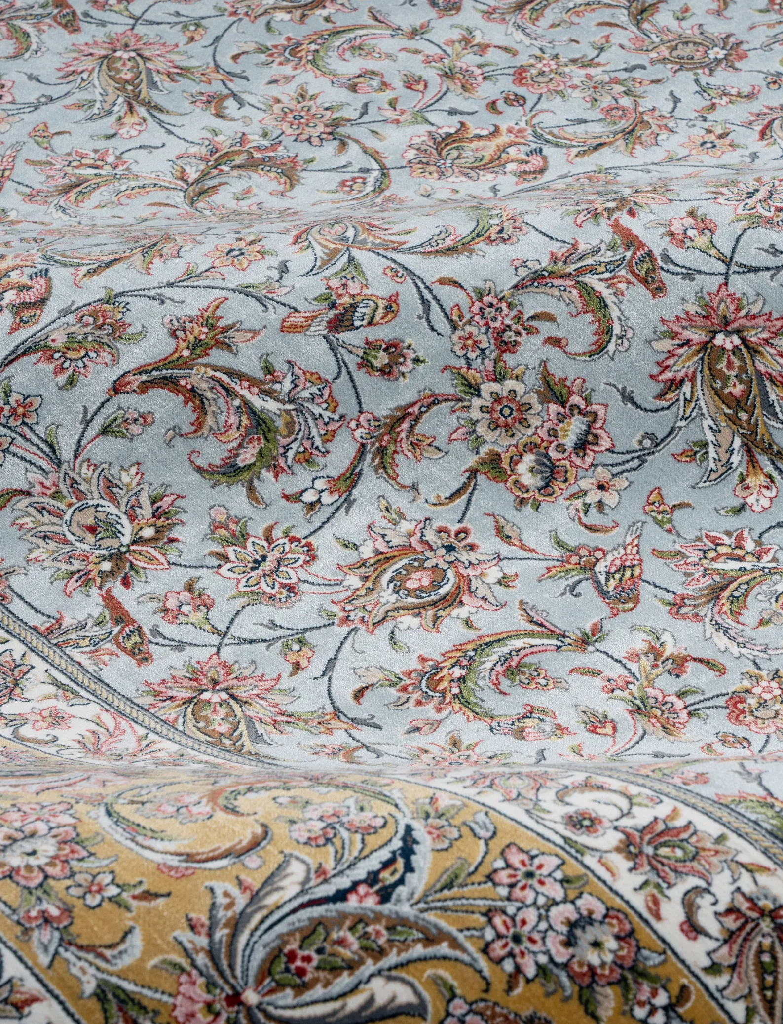 - بافت ریزبافت برجسته دستبافتگونه: شانه ۱۵۰۰ + تراکم ۴۵۰۰ = بیش از ۲.۵ میلیون گره در مترمربع، ارتفاع خاب ۶-۸ میلیمتر برای جلوه سهبعدی طبیعی و مقاومت بالا.