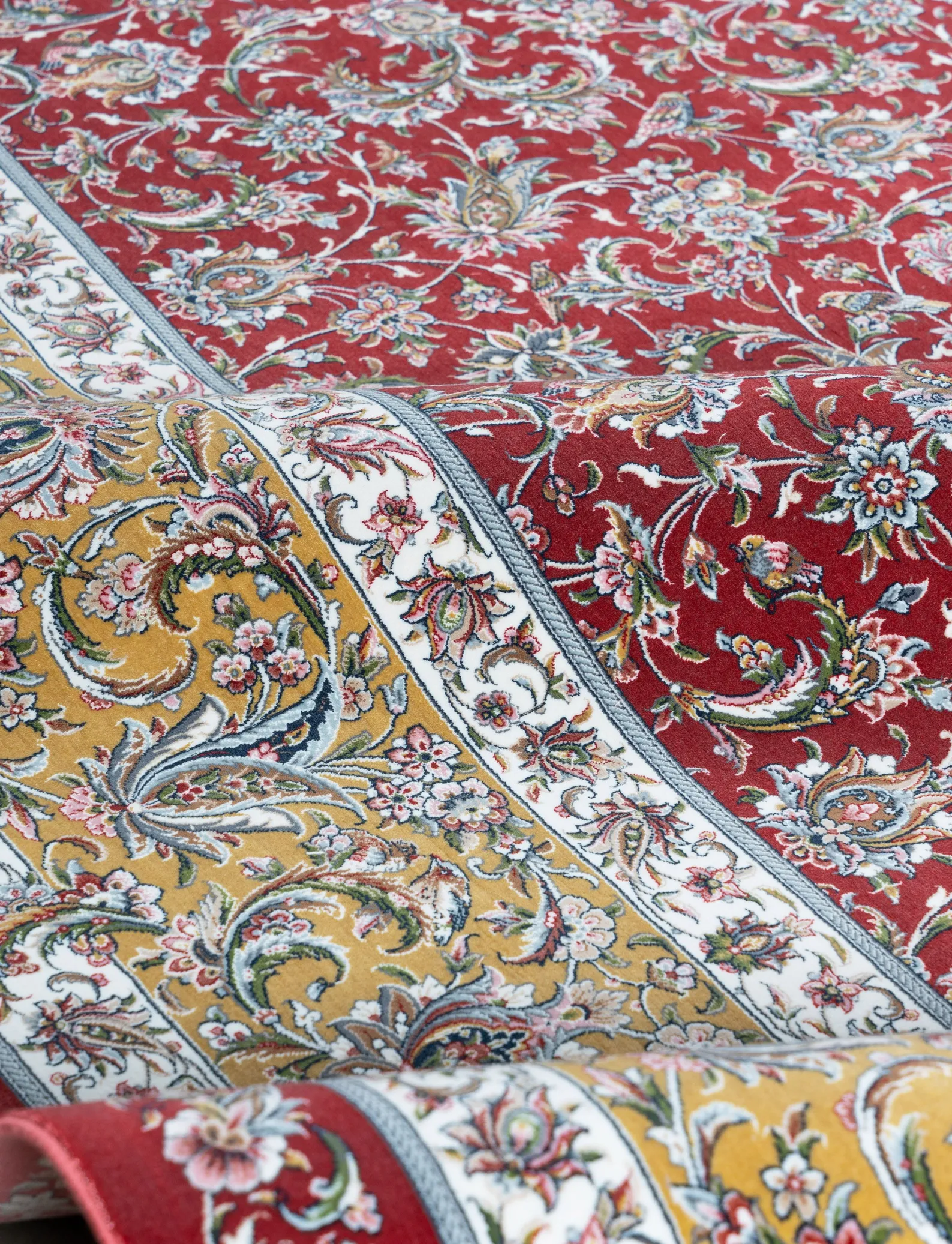 - بافت ریزبافت برجسته دستبافتگونه: شانه ۱۵۰۰ + تراکم ۴۵۰۰ = بیش از ۲.۵ میلیون گره در مترمربع، ارتفاع خاب ۶-۸ میلیمتر برای جلوه سهبعدی طبیعی و مقاومت بالا.