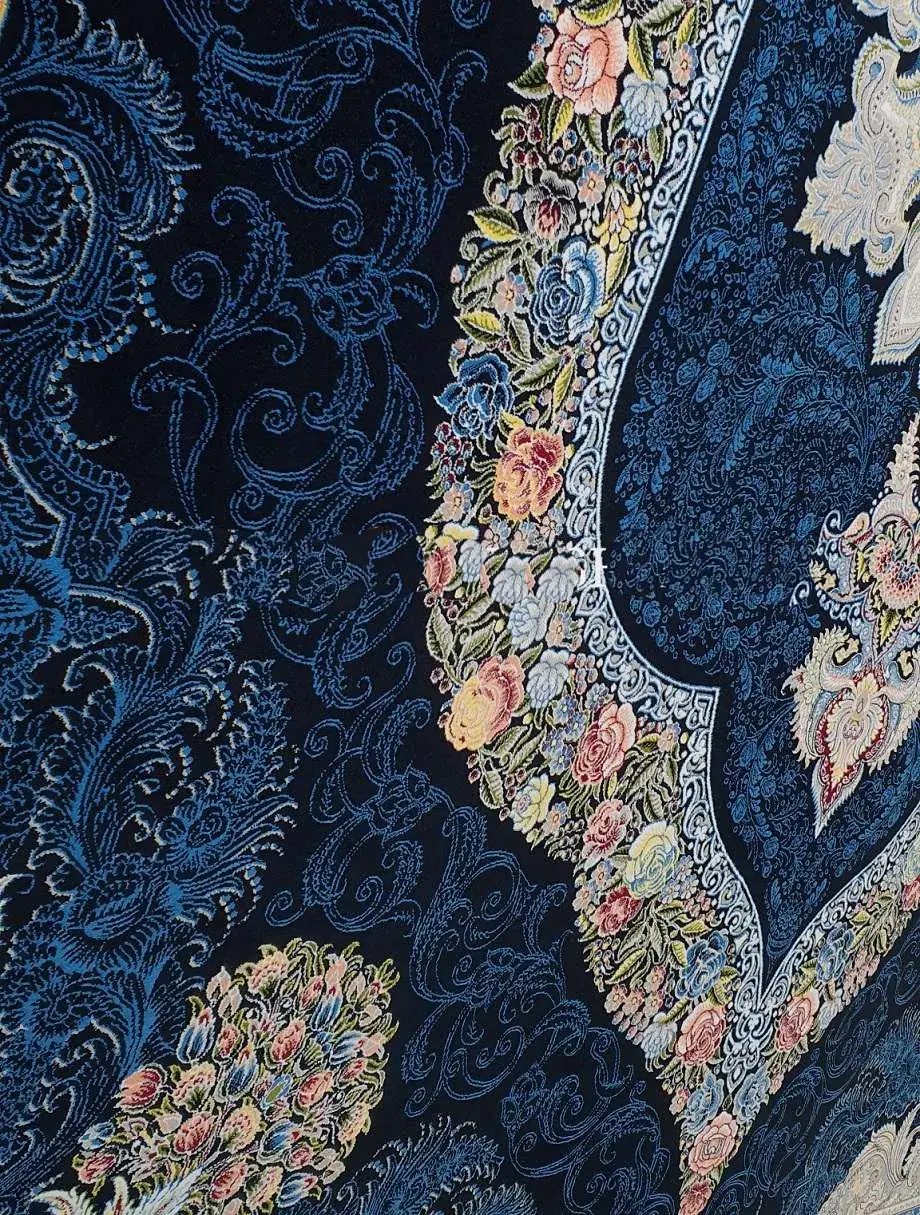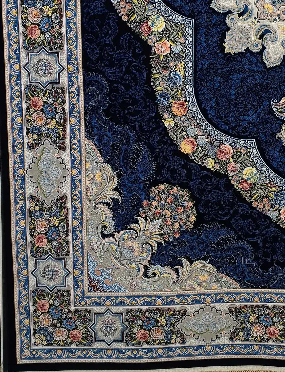 فرش کاشان 700 شانه طرح کارینا زمینه سورمه ای (غیربرجسته)