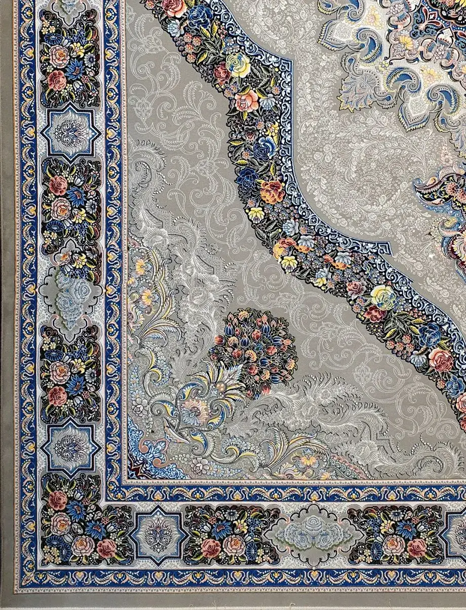 فرش کاشان ۷۰۰ شانه طرح کارینا با تراکم ۲۵۵۰ | زیبایی مدرن با اصالت ایرانی در رنگهای سورمهای، کرم و فیلی