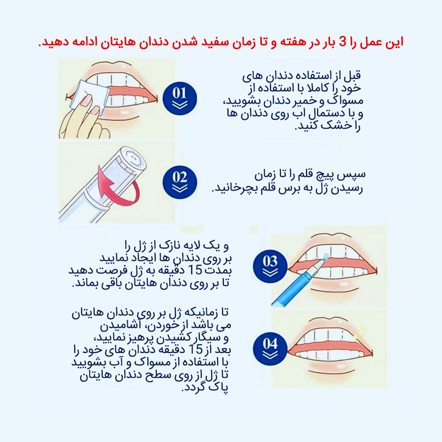 قبل از استفاده دندان های خود را کاملا با استفاده از مسواک و خمیر دندان بشویید، و با دستمال اب روی دندان ها را خشک کنید. سپس پیچ قلم را تا زمان رسیدن ژل به برس قلم بچرخانید و یک لایه نازک از ژل را بر روی دندان ها ایجاد نمایید. بمدت 15 دقیقه به ژل فرصت دهید تا بر روی دندان هایتان باقی بماند، تا زمانیکه ژل بر روی دندان هایتان می باشد از خوردن، آشامیدن و سیگار کشیدن پرهیز نمایید، بعد از 15 دقیقه دندان های خود را با استفاده از مسواک و آب بشویید تا ژل از روی سطح دندان هایتان پاک گردد، تا 2 ساعت بعد از استفاده از ژل از مصرف چای، قهوه، مواد کافئین دار، سیگار و قلیان اکیدا خودداری نمایید، این عمل را 3 بار در هفته و تا زمان اتمام محصول ادامه دهید، نتیجه اصلی بعد از اتمام یک دوره مشاهده خواهد شد. دقت نمایید این محصول برای افرادی که دارای دندان کامپوزیت یا لمینت هستند کارایی ندارد.