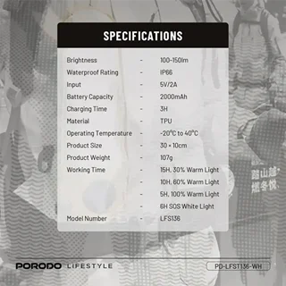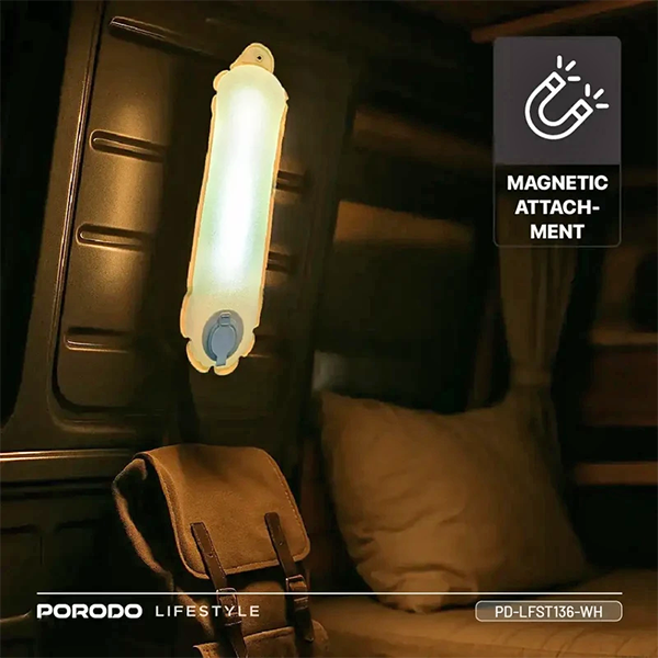 چراغ لولهای مغناطیسی بادی Porodo Lifestyle یک گزینه روشنایی فضای باز همه کاره و بادوام برای ماجراجویی است. میزان روشنایی آن ۱۰۰-۱۵۰ لومن و درجه حفاظت IP66 برای نفوذ آب است. علاوه بر این، باتری ۲۰۰۰ میلیآمپر ساعتی آن ۱۵ ساعت کار با ۳۰٪ نور گرم، ۱۰ ساعت با ۶۰٪ نور گرم، ۵ ساعت نور گرم با ظرفیت کامل و ۶ ساعت نور سفید SOS را ارائه میدهد. با چنین مواد سبک و بادوامی، از جمله TPU، این چراغ به سرعت از طریق پورت شارژ Type C شارژ میشود. ویژگی اتصال مغناطیسی آن به نصب آسان روی سطوح فلزی کمک میکند. بنابراین، به عنوان همراهی برای کمپینگ در فضای باز، پیادهروی یا موارد اضطراری مناسب است. با دمای عملیاتی از -۲۰ درجه سانتیگراد تا ۴۰ درجه سانتیگراد، این چراغ برای همه شرایط آب و هوایی آماده است.